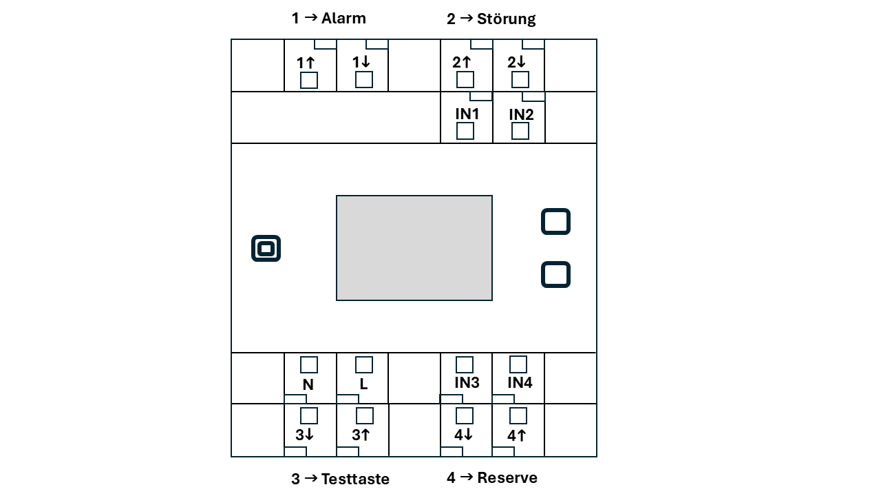 Die Störungsmeldung "2" und die Testtaste "3" sind ebenfalls als Potentialfreier Schließer außgeführt und können je nach Bedarf optional genutzt und angeschlossen werden.