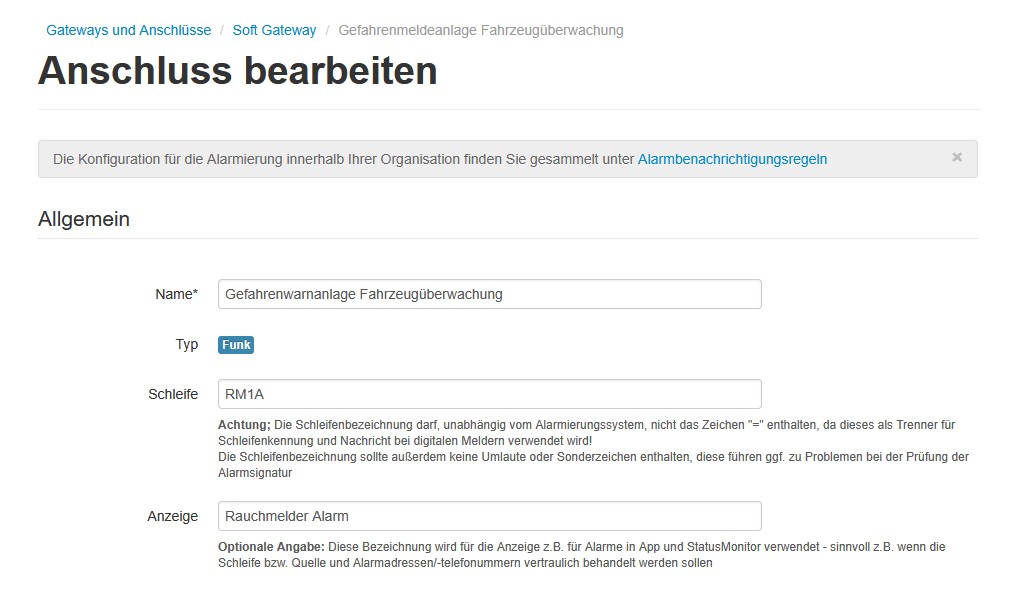 - Im Abschnitt "Admin" -> "Gatways und Anschlüsse -> Softgateways -> Bearbeiten -> [Anschluss wählen] -> Bearbeiten -> Feld "Schleife" wird die Schleifenbezeichnung angezeigt. Diese benötigen wir